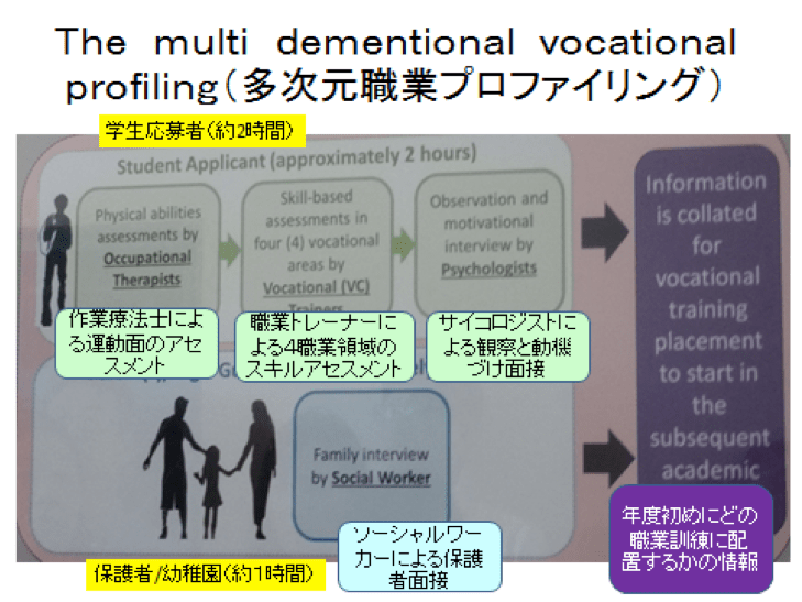 これらの背景から、まず、ここに学ぶほとんどの子どもが私たち見学者に挨拶をかわし、着席での学習も、求められる作業への取り組みも可能な状態でした。自閉症のお子さんはいないので、クールダウンのお部屋も必要ないとのことでした。このような学校で、着目すべきは移行支援の充実です。まず就学前からアセスメントを開始します。興味関心だけではなく、能力に見合った職業学習につなげるためです。